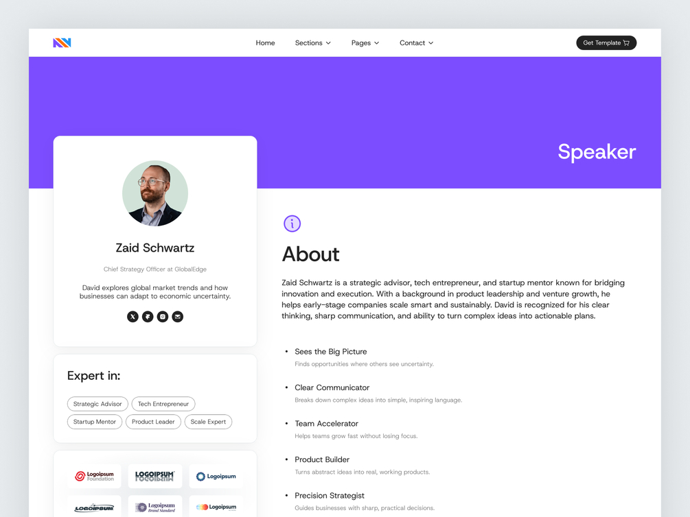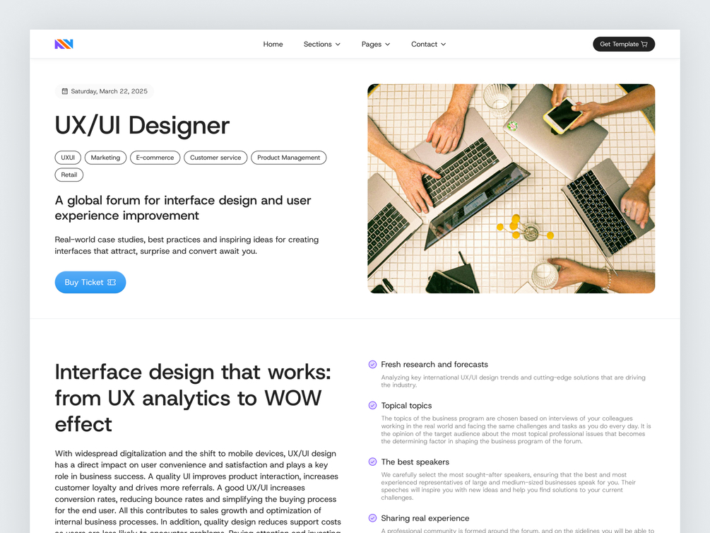 From speaker profiles and schedules to ticket tiers and testimonials, NextForum comes equipped with a rich set of UI components tailored for event-based websites. Focus on your content — the design system does the rest, ensuring a cohesive and polished look throughout.