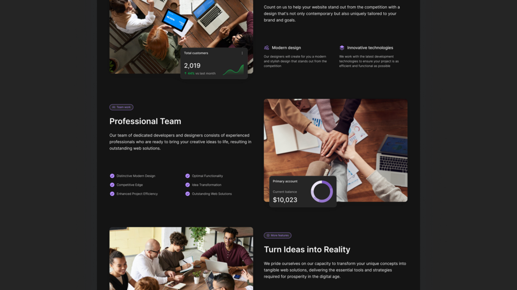 Minimalism, smooth animations, dark mode, perfectly matched colors and universal adaptation - it's all on your website. Master the space with multiple UI elements, create an amazing user experience and attract attention on any device. PixelPerfect is your key to web excellence!